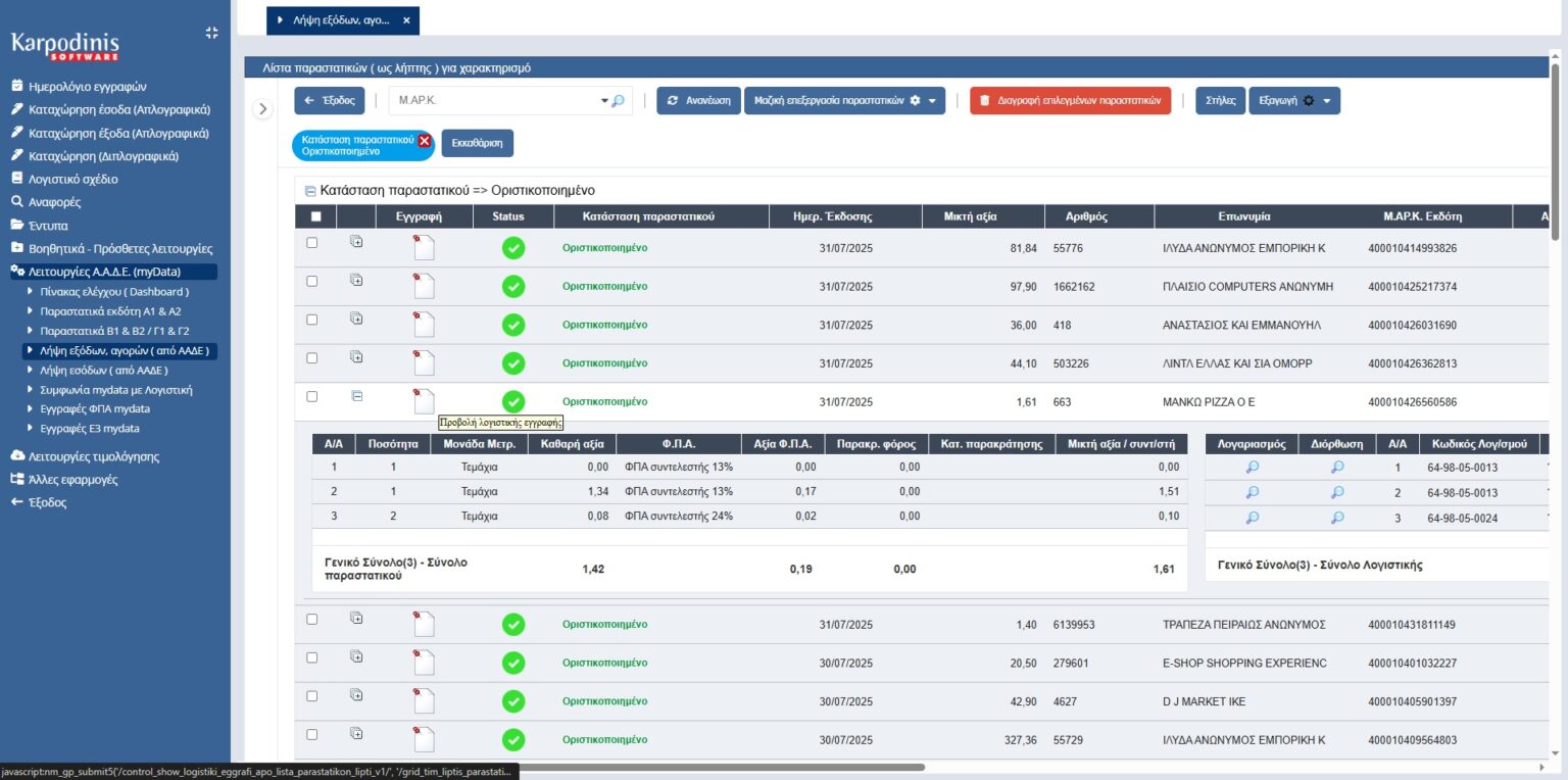 - Άντληση Παραστατικών από το myDATA σε συναλλαγές εσόδων, αγορών, εξόδων με ένα κλικ.