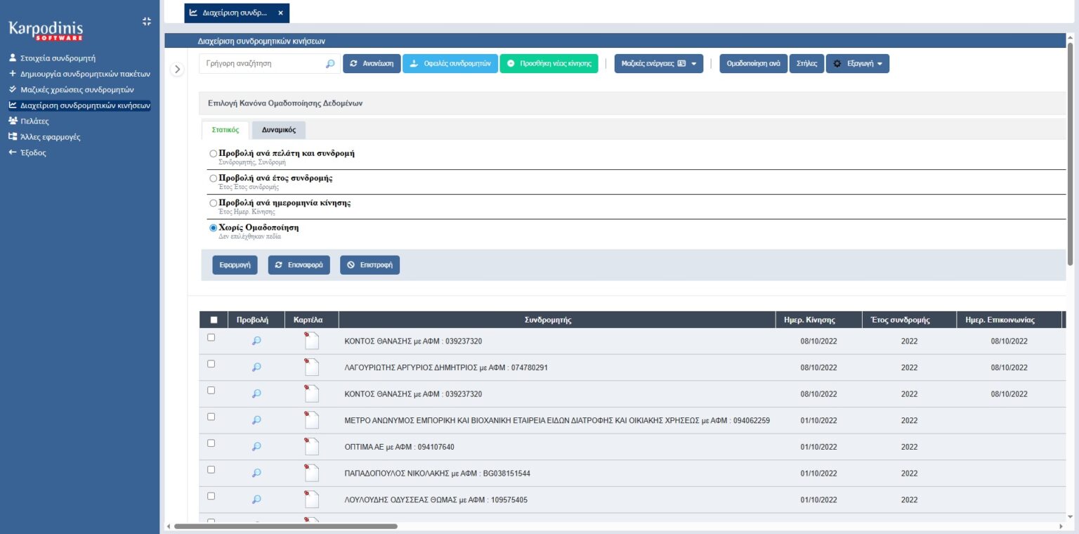 Προβολής των συνδροµητικών κινήσεων με έτοιμες ομαδοποιήσεις των συνδρομών ή δυναμικά από τον χρήστη