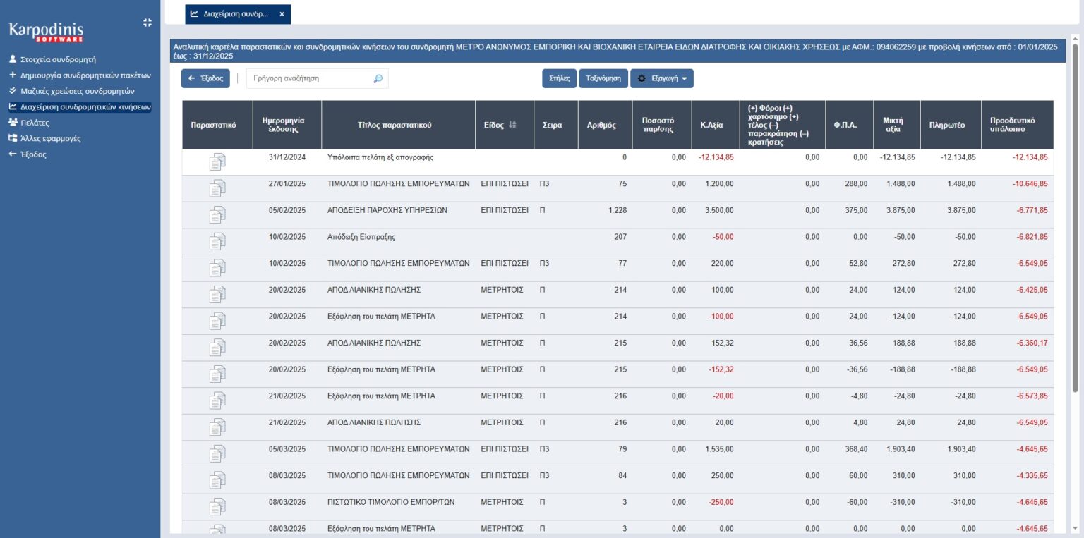 - Παρακολούθηση και ενηµέρωση συνοπτικά και αναλυτικά της εικόνας του συνδροµητή ώστε να γνωρίζουµε πότε τον χρεώσαµε, πότε τον ενηµερώσαµε για να προβεί σε κατάθεση, πότε έγινε η κατάθεση και πότε έκλεισε η εκκρεµότητα µε την έκδοση του νόµιµου παραστατικού.