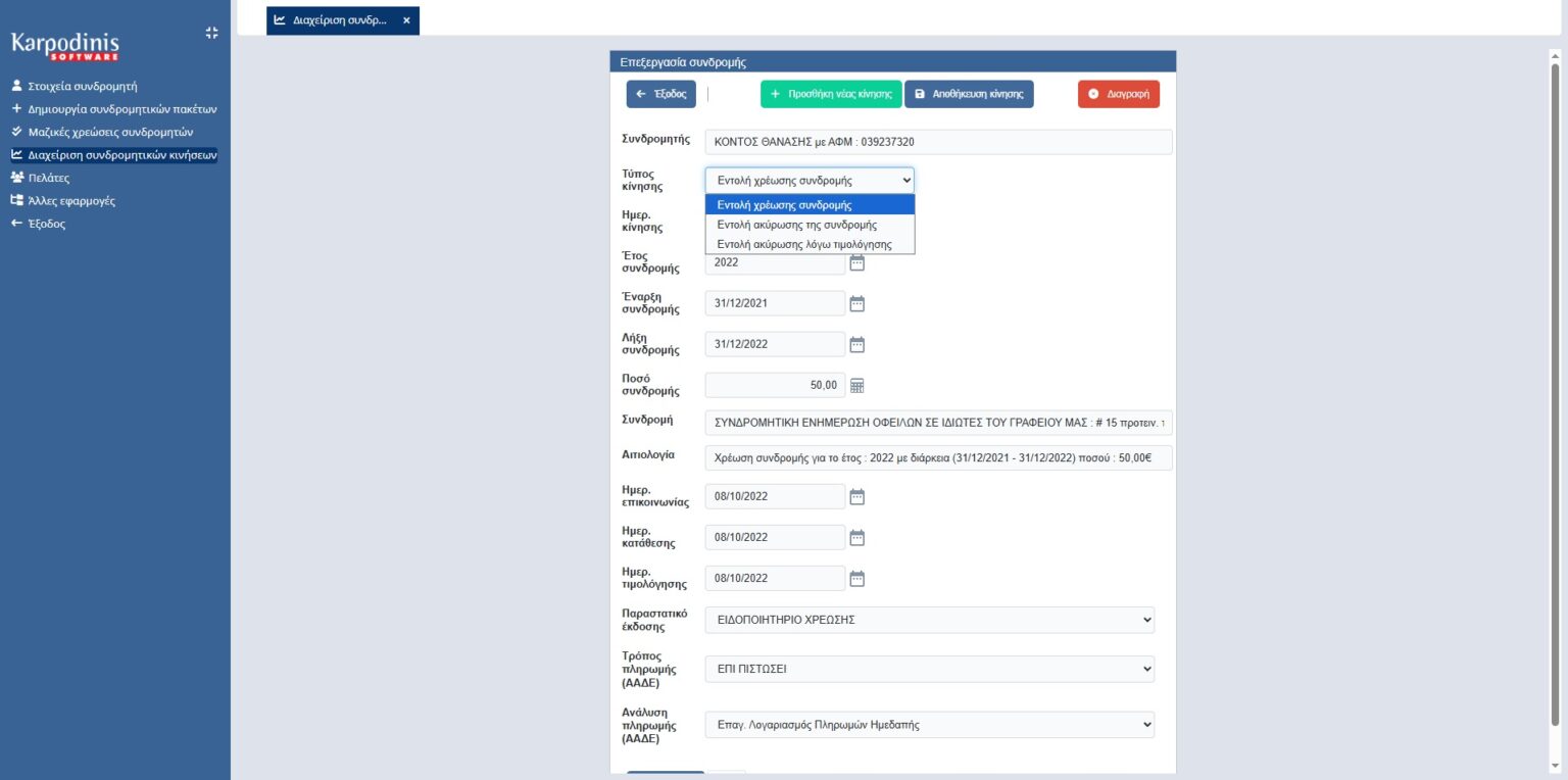 Η Διαχείριση Συνδροµών ενσωµατώνει τις παρακάτω δυνατότητες