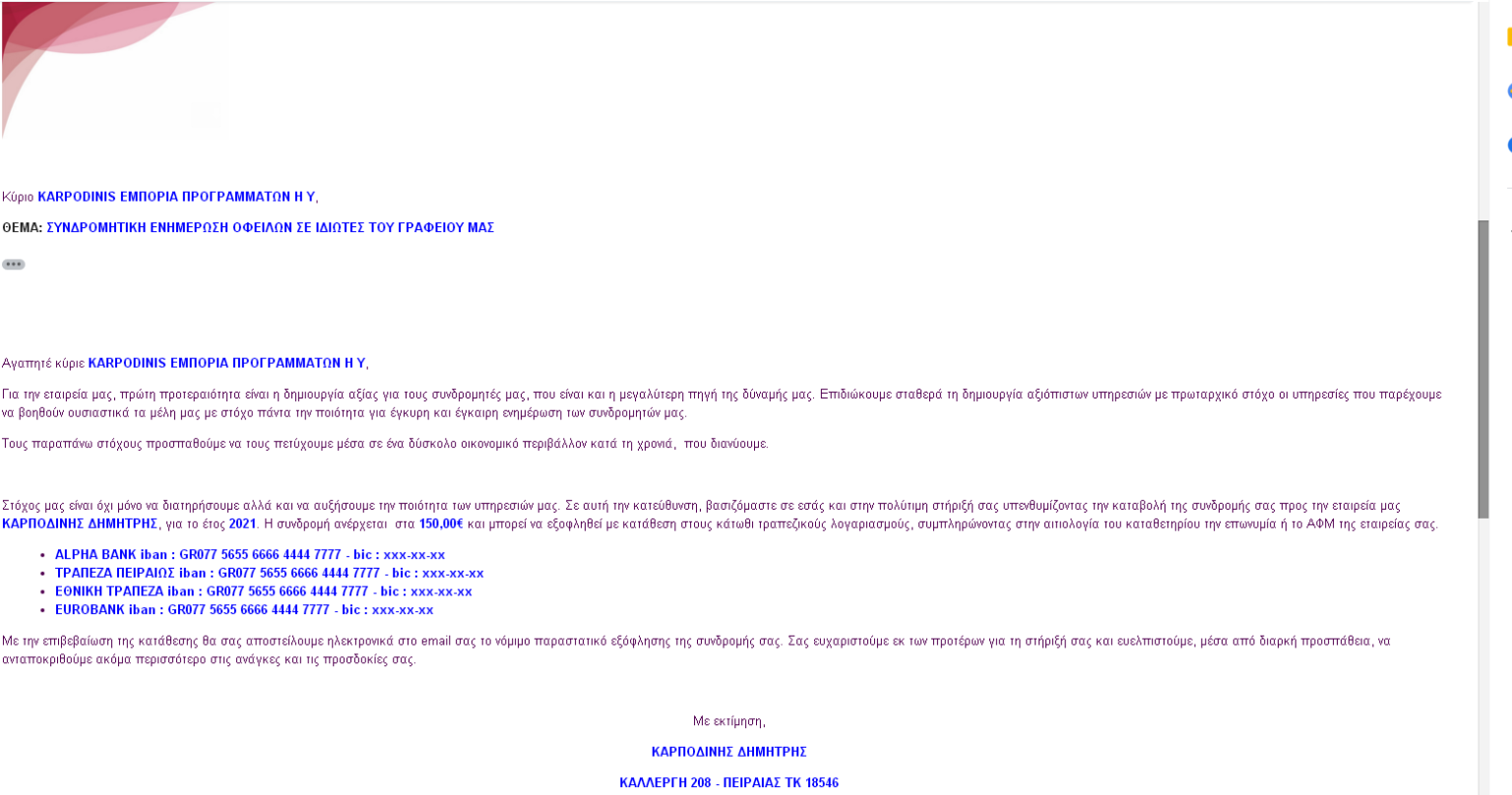 - Μαζική ενηµέρωση των συνδροµητών µε προσωποποιηµένες επιστολές για την ανανέωση και καταβολή της συνδροµής τους.