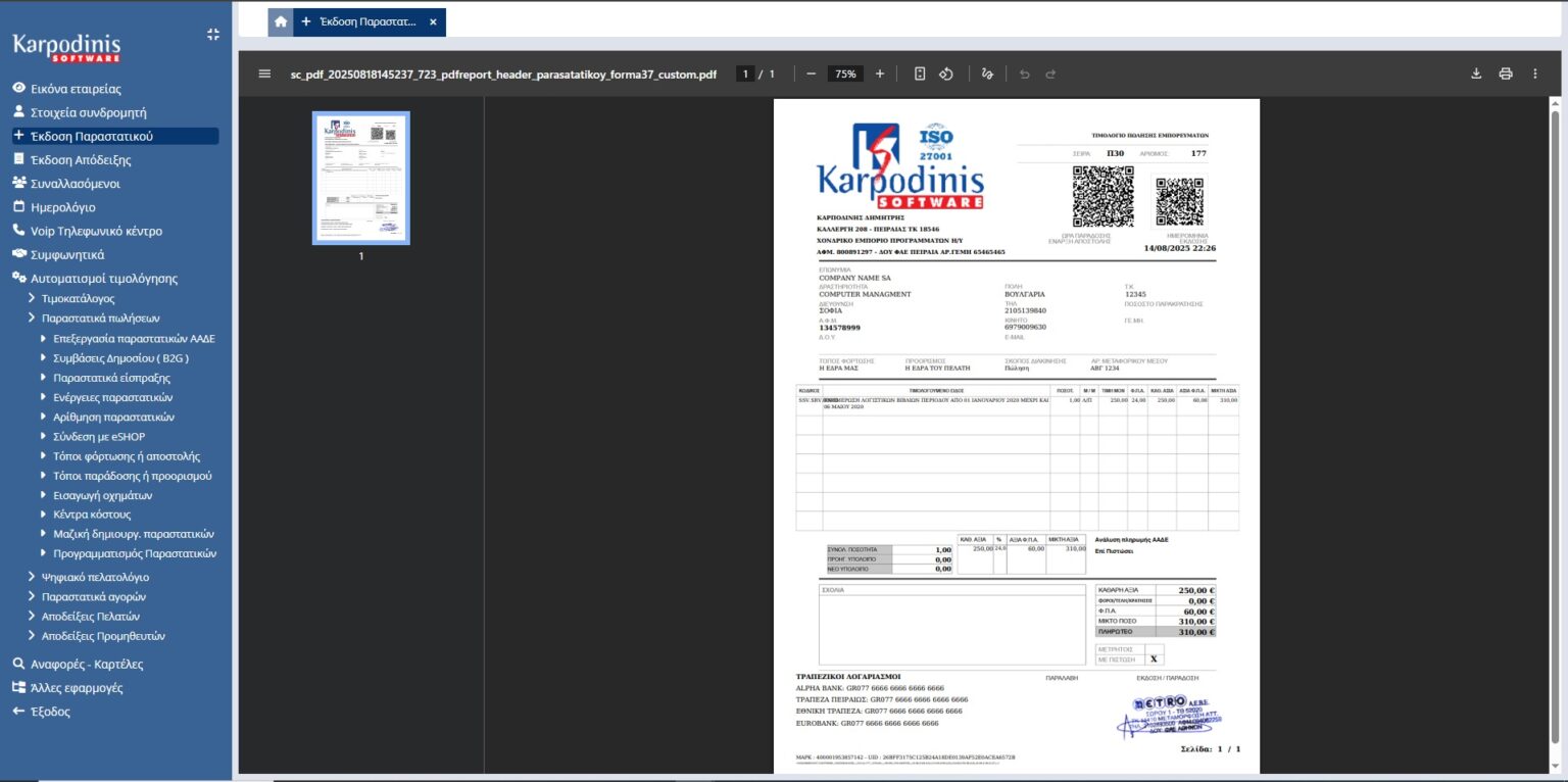 - Η εφαρµογή πραγµατοποιεί τις µαζικές εκδόσεις των παραστατικών µόνο στους πελάτες που δεν έχουν τιµολογηθεί και έχουν προβεί σε κατάθεση ενηµερώνοντας ταυτόχρονα την λογιστική τους καρτέλα και ακυρώνοντας την αρχική χρέωση συνδροµής λόγω έκδοσης παραστατικού.