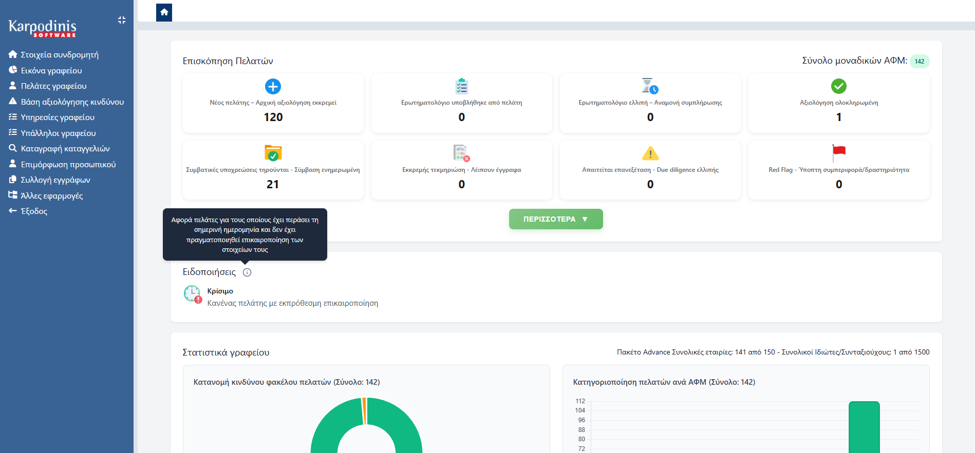 Παρακολουθήστε όλους τους πελάτες σας σε ένα σύγχρονο dashboard με χρωματική κατηγοριοποίηση, φίλτρα αναζήτησης και άμεση επισκόπηση κατάστασης.